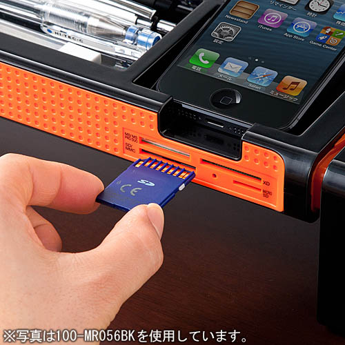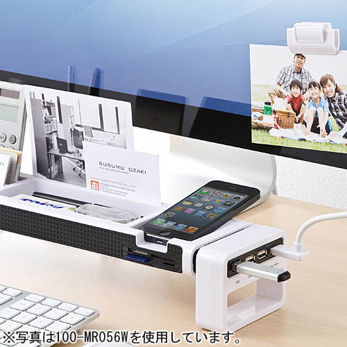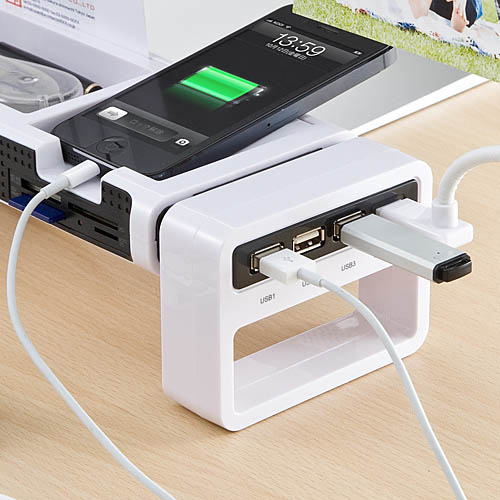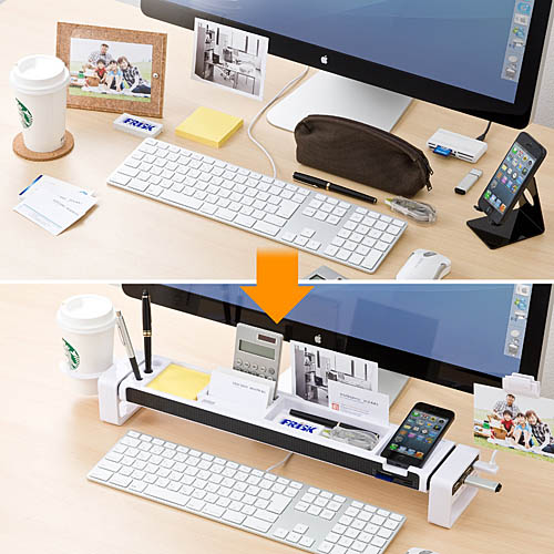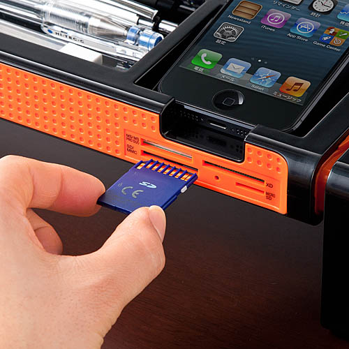 拥有多达10种功能的桌上架:USB接口、读卡器卡槽、笔插、名片槽、照片槽、智能手机收纳台等。