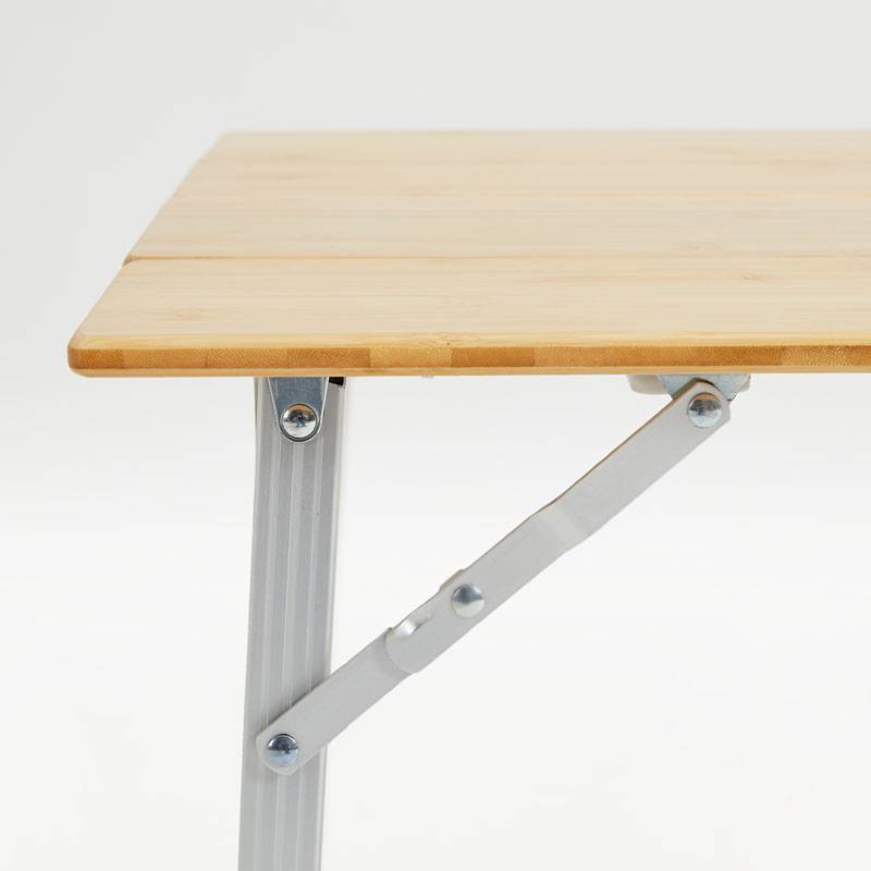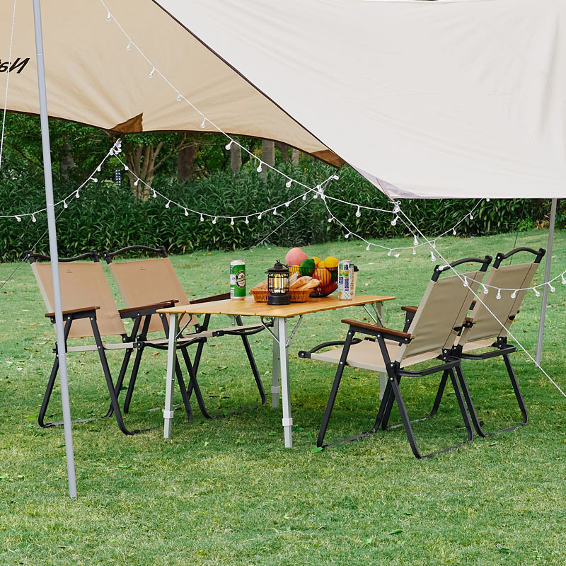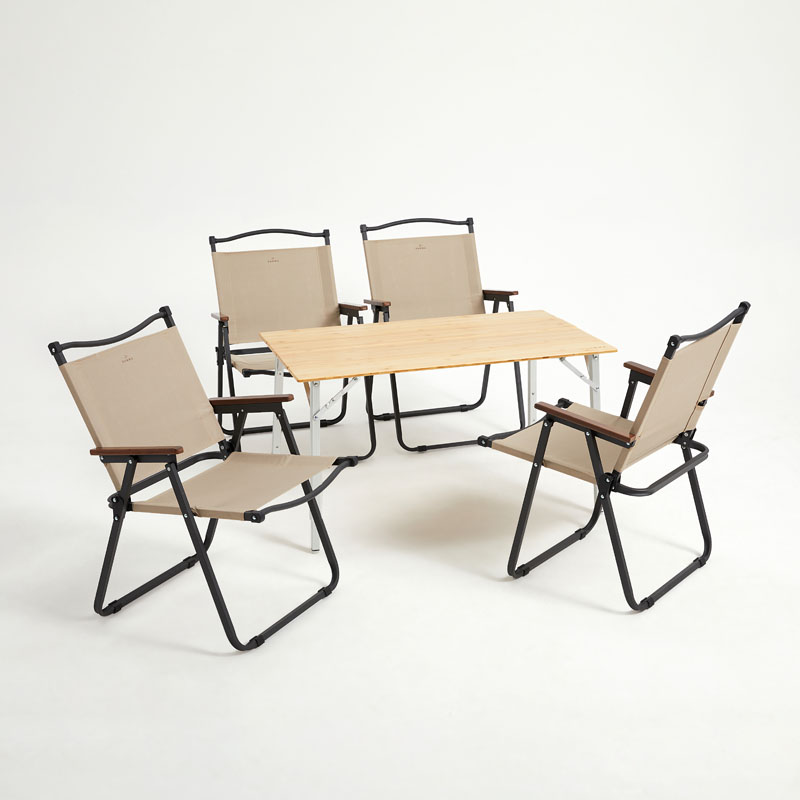 折叠椅:框架/铁、木扶手/碳化竹木+清漆、靠背座面/600D双层牛津布 折叠桌:框架/铝合金、桌板/竹木+清漆